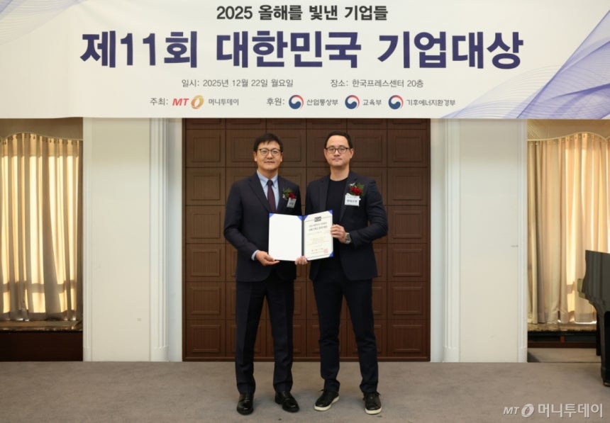 배준수 엔에프엔(NFN) 플랫폼센터장(사진 오른쪽)이 22일 오후 서울 중구 한국프레스센터에서 열린 머니투데이 주최의 '2025 제11회 대한민국 기업대상' 시상식에서 'AI 기반 HR 진단·분석 플랫폼' 부문 '서비스혁신' 분야 대상을 수상한 뒤 송기용 머니투데이 전무와 기념 촬영 중이다.