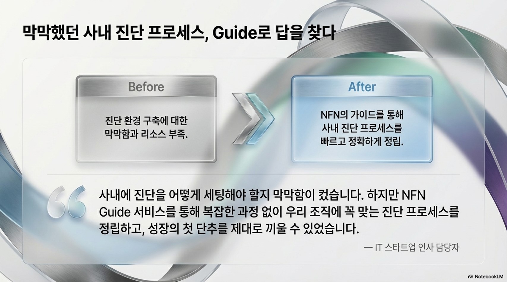 실제로 서비스를 선제 도입한 IT 스타트업 담당자님은 "막막했던 사내 진단 프로세스를 NFN의 가이드를 통해 빠르게 정립할 수 있었다"며 높은 만족도를 보여주셨습니다.