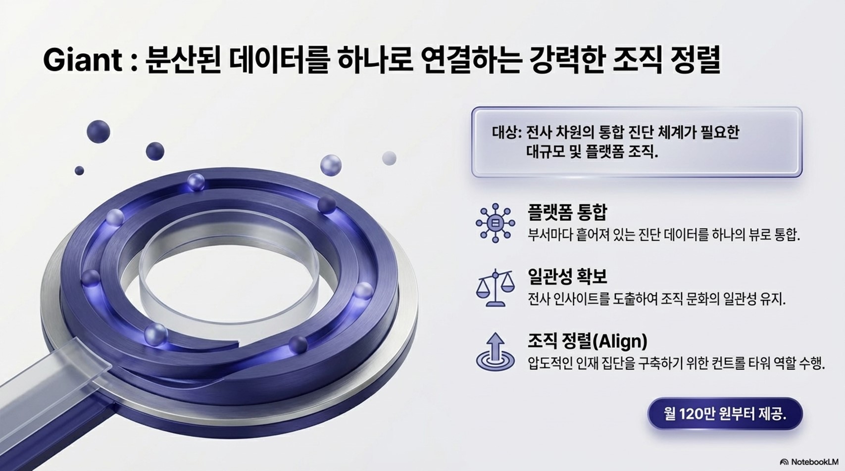 부서마다 흩어져 있는 진단 데이터를 하나로 통합하세요. 전사 차원의 통합 인사이트를 통해 조직 문화의 일관성을 확보하고, 압도적인 인재 집단을 구축하는 컨트롤 타워 역할을 수행합니다.