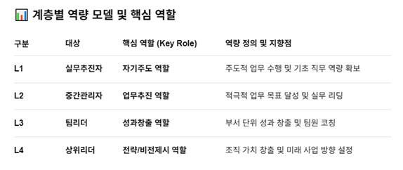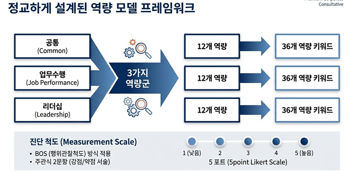 - 공통역량, 리더십역량, 업무수행 역량을 중심으로 설계되어, 개인이 자신의 수준을 객관적으로 점검할 수 있습니다.
