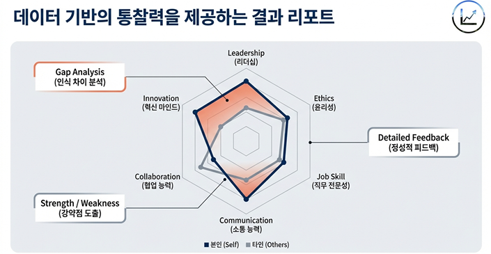 - 진단이 끝나면 개인별 강점과 보완점이 담긴 상세 리포트가 자동 생성됩니다. 이를 통해 맞춤형 교육 과정을 추천하거나 구체적인 HRD 전략을 세울 수 있습니다.