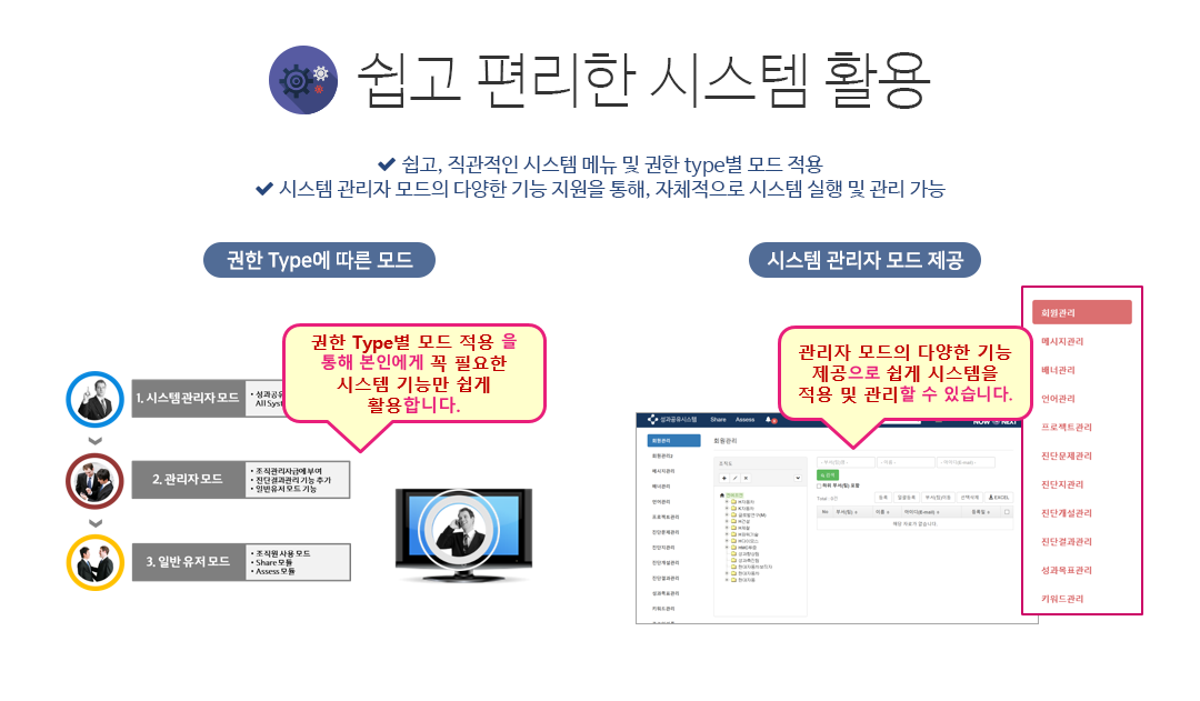 조직 맞춤형으로 활용할 수 있도록 진단시스템을 제공합니다.